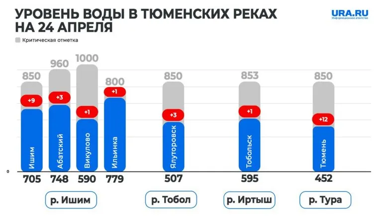 «Река Тура. Уровень воды вырос на 12 сантиметров за сутки. Текущий уровень: 452 сантиметров. Критическая отметка: 850 сантиметров», — отмечено на сайте.