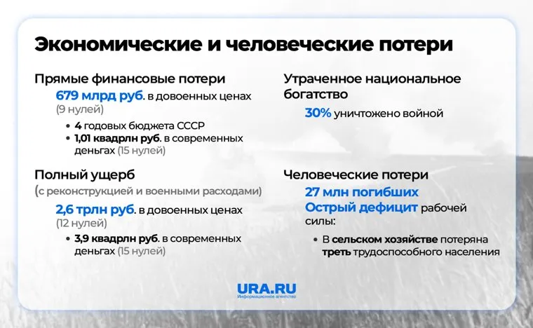 По данным проекта «Сурский рубеж», прямые финансовые потери составили 679 миллиардов рублей, что эквивалентно почти четырем годовым бюджетам СССР довоенного времени. Эта сумма равна примерно 1,01 квадриллиона современных российских рублей*. Полный ущерб, включая затраты на реконструкцию заводов, восстановление инфраструктуры и военные расходы, достиг 2,6 триллиона рублей (около 3,9 квадриллиона современных рублей*). Эти цифры иллюстрируют масштаб задачи, стоявшей перед страной. Война уничтожила 30% национального богатства, а человеческие потери — 27 миллионов жизней — создали острый дефицит рабочей силы, особенно в сельском хозяйстве, где треть трудоспособного населения деревень погибла или ушла в города.