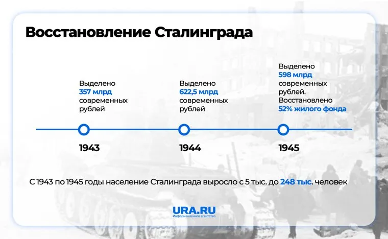 Восстановление Сталинграда началось уже в 1943 году, несмотря на продолжавшуюся войну. В 1943 году на отстройку города было выделено 239 миллионов рублей (357 миллиардов современных рублей*), в 1944 году — 418 миллионов (622,5 миллиарда рублей*), в 1945 году — 404 миллиона (598 миллиардов рублей*), пишет портал «Русская семерка». Эти суммы были огромными для военного времени, но их не хватало из-за нехватки рабочих рук и техники. Тем не менее, к 1945 году удалось восстановить 52% жилого фонда (530 тысяч квадратных метров). Жители Сталинграда получали долгосрочные ссуды на строительство жилья — в общей сложности 48,5 миллиона рублей (около 72 миллиардов современных рублей). В августе 1945 года было принято специальное постановление «О мерах по восстановлению Сталинграда», предусматривавшее дополнительные бюджетные средства. С 1943 по 1945 год население города выросло с пяти тысяч до 248 тысяч человек.