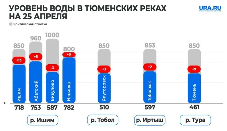 «Гидропост Ишим — Ишим. Уровень воды — 718 см, изменения за сутки +13 сантиметров», — указано на сайте сервиса.