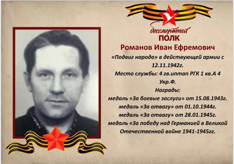 За годы службы Иван Романов был удостоен двух медалей «За отвагу», медалей «За боевые заслуги» и «За победу над Германией в Великой Отечественной войне». Он не рассказывал внучке о собственных подвигах — боевую историю деда она позже узнала из документов.