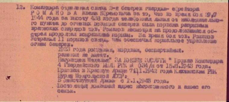 Запись о награждении Ивана Романова за героическое восстановление связи в бою за высоту