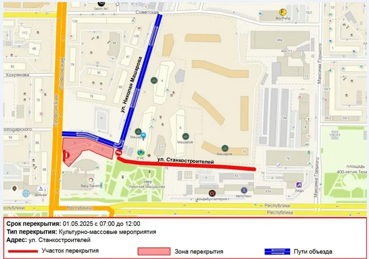 В Тюмени 1 мая запланировано перекрытие движение транспорта на улице Станкостроителей. Об этом URA.RU сообщили в администрации города.