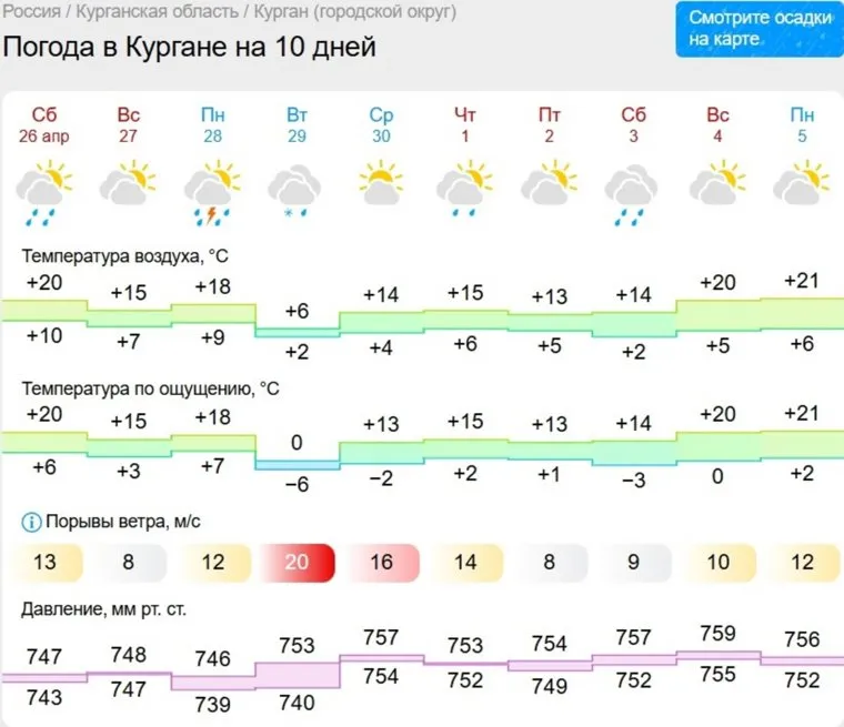 «В Кургане в ближайшие дни, а также в первых числах мая ожидается теплая погода с температурой воздуха около 20-23 градусов. В понедельник, 28 апреля, вероятна гроза и до 18 градусов тепла. Во вторник — снег и резкое похолодание, а также штормовой ветер до 20 метров в секунду», — сообщается на сайте Gismeteo.