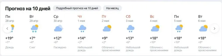 О перепадах температур говорится и в сервисе «Яндекс.Погода». В течение рабочей недели ночные температуры воздуха составят около 2-6 градусов, днем — до 7-13. Почти вся неделя будет пасмурной и с осадками в виде небольших дождей.