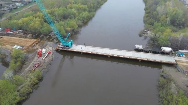 Строители начали монтировать пролеты курганского моста, который снесло паводком. Фото
