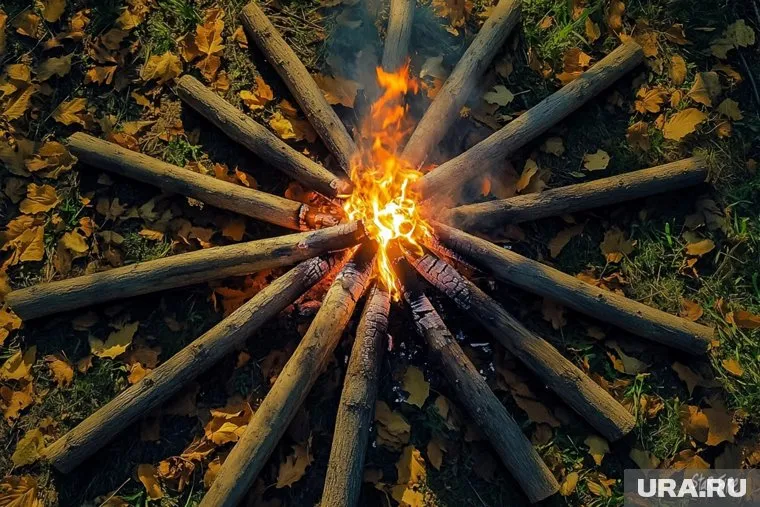 Для этого костра бревна укладываются лучами от центра, где разводится небольшой огонь. По мере сгорания концов бревна подвигают к центру.