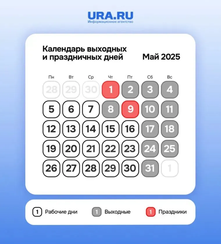 Первая длинная пауза ждет россиян с 1 по 4 мая — это дни, примыкающие к Празднику Весны и Труда. Вторая волна каникул начнется 8 мая и завершится вечером 11-го: страна отмечает День Победы. Кроме праздничных дат, в майском графике остаются обычные субботы и воскресенья 17-18, 24-25 и 31 мая. Поэтому на работу выходим 5-7, 12-16, 19-23 и 26-30 числа.