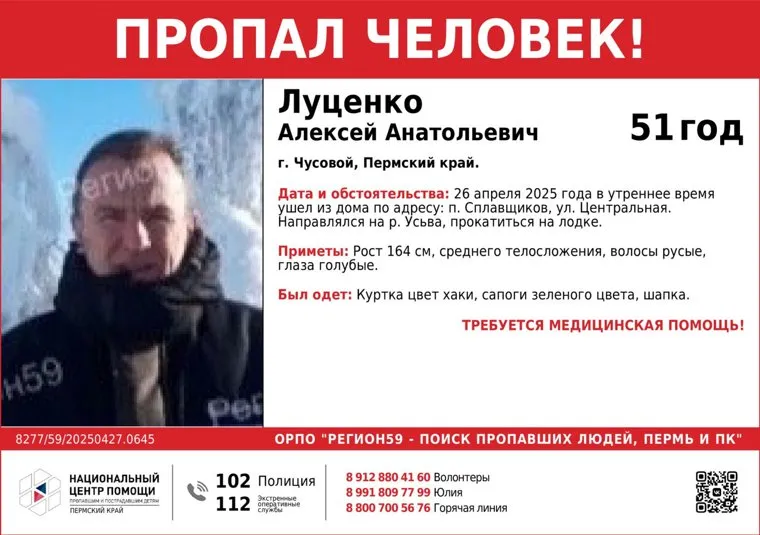 «Поиск Алексея Луценко, 51 год. Он утром 26 апреля 2025 года ушел из дома в поселке Сплавщиков по улице Центральной. Направлялся на Усьву, чтобы прокатиться на лодке. С тех пор его местонахождение неизвестно», — указано в telegram-канале волонтеров.