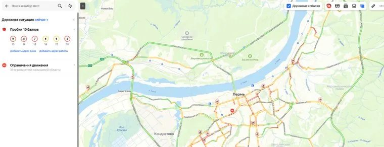 Пробки на дорогах Перми достигли 10 баллов. Скрин
