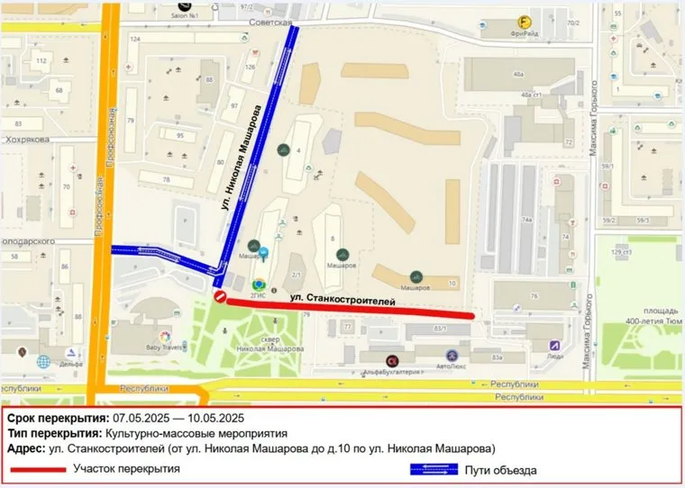 «В связи с проведением мероприятия, посвященного празднованию 80-й годовщины Победы в Великой Отечественной войне, планируется прекратить движение транспортных средств на улице Станкостроителей. Перекрытие будет действовать от пересечения с улицей Николая Машарова до дома № 10 по той же улице», — говорится в сообщении.