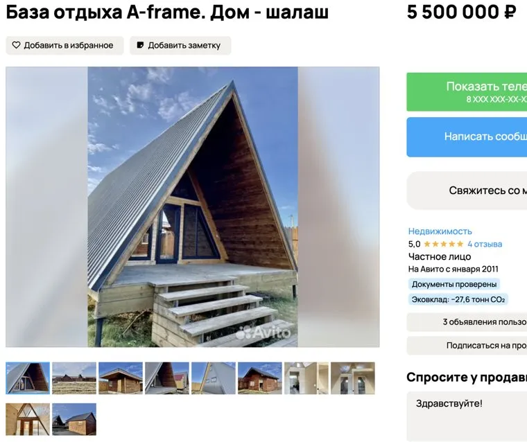 «Продаю построенную на 70% базу отдыха: два дома А-фрейм. Размер 6 на 8 метров плюс крытая терраса, две бани пять на пять метров. Отличный вариант для начала деятельности, развития туризма», — написал автор объявления.