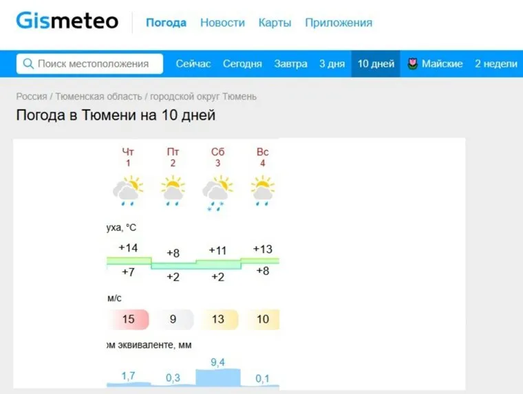 «В четверг, 1 мая, в Тюмени ожидается сильный ветер с порывами до 15 метров в секунду. В течение всего дня ожидается дождь. Температура воздуха составит 14 градусов», — уточняет ресурс.