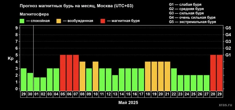 В течение этой недели метеозависимым людям беспокоиться не стоит: до понедельника магнитосфера Земли останется в состоянии покоя. Но уже 5 мая геомагнитная активность резко подскочит до «красных» значений. В период с понедельника по среду ученые прогнозируют магнитную бурю, которая начнет сходить на нет с приближением праздников.