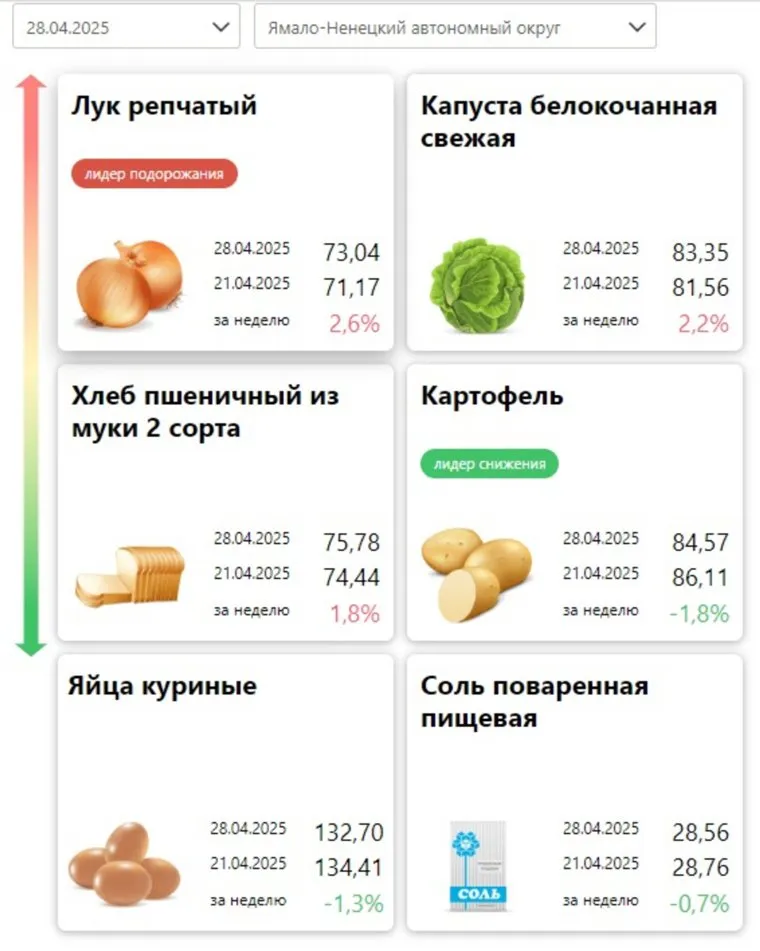 «Мониторинг средних розничных цен на отдельные виды социально значимых продовольственных товаров первой необходимости — лук. За неделю рост составил 2,6%. В Ямальском районе цена составляет 112,5 рубля», — сообщается на портале ИАС «Мониторинг Ямал».
