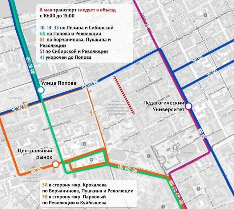 Маршрут №41 сократят до улицы Попова. Автобус №50 в сторону Крохалевки следует по улицам Борчанинова, Пушкина и Революции, а в сторону Паркового — по улицам Революции и Куйбышева. 8 мая автобусы также будут следовать в объезд с 10:00 до 15:00, при этом маршруты объезда для перечисленных автобусов сохранятся с незначительными изменениями.