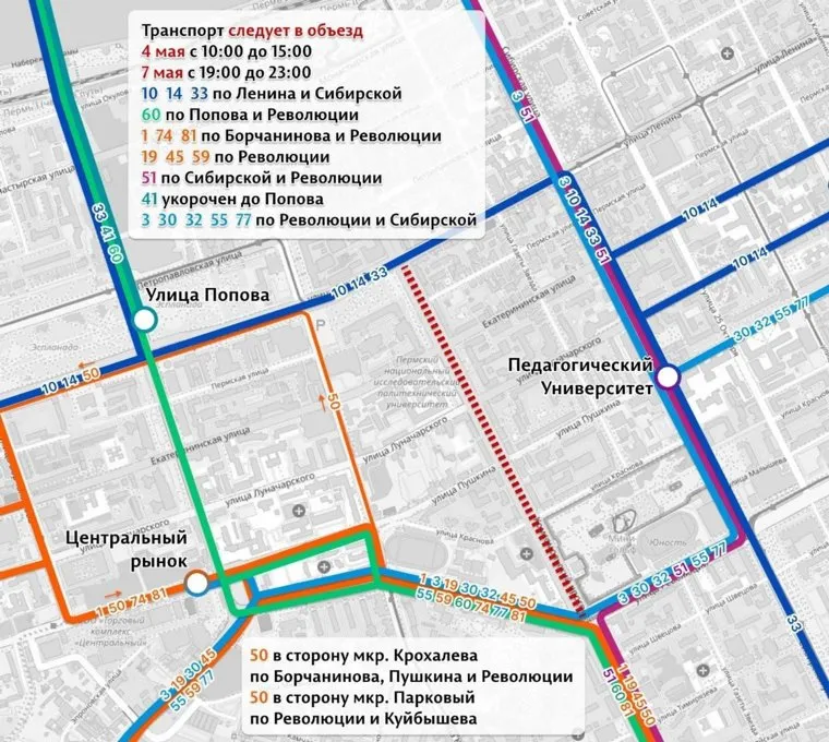 Как уточняется в сообщении, 4 мая автобусы следуют в объезд с 10:00 до 15:00, а 7 мая — с 19:00 до 23:00. «Автобусы №№10, 14, 33 объезжают по улицам Ленина и Сибирской, а №60 — по улицам Попова и Революции. №№1, 74 и 81 идут по улицам Борчанинова и Революции, №№19, 45 и 59 по улице Революции, №51 — по улицам Сибирской и Революции. Автобусы №№3, 30, 32, 55 и 77 идут по улицам Революции и Сибирской», — предупредили в дептрансе Перми.