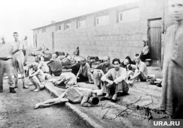 Узники немецкого концлагеря Маутхаузен, приговорённые к уничтожению за нарушение режима, у барака «блок смерти»