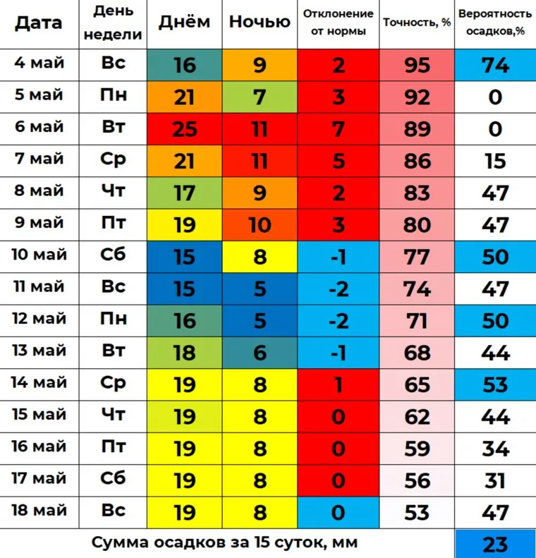 С 10 по 13 мая прогнозируется понижение температуры. Днем до 15 градусов, а ночью до 5 градусов. Пройдут слабые кратковременные дожди. После 13 мая температура повысится до климатической нормы. Днем 18-20 градусов, а ночью 7-9 градусов.