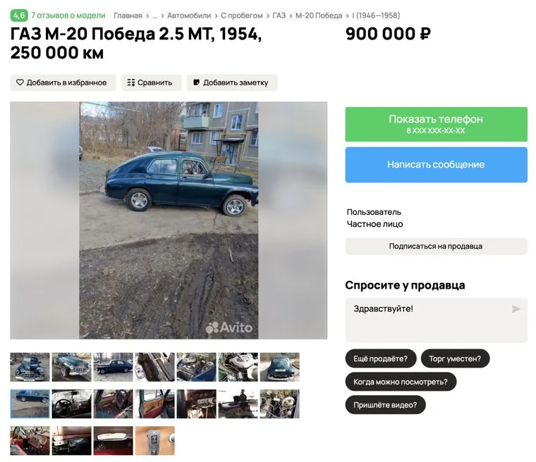 Фото: Скрин сайта «Авито». https://www.avito.ru/magnitogorsk/avtomobili/gaz_m-20_pobeda_2.5_mt_1954_250_000_km_7239732916