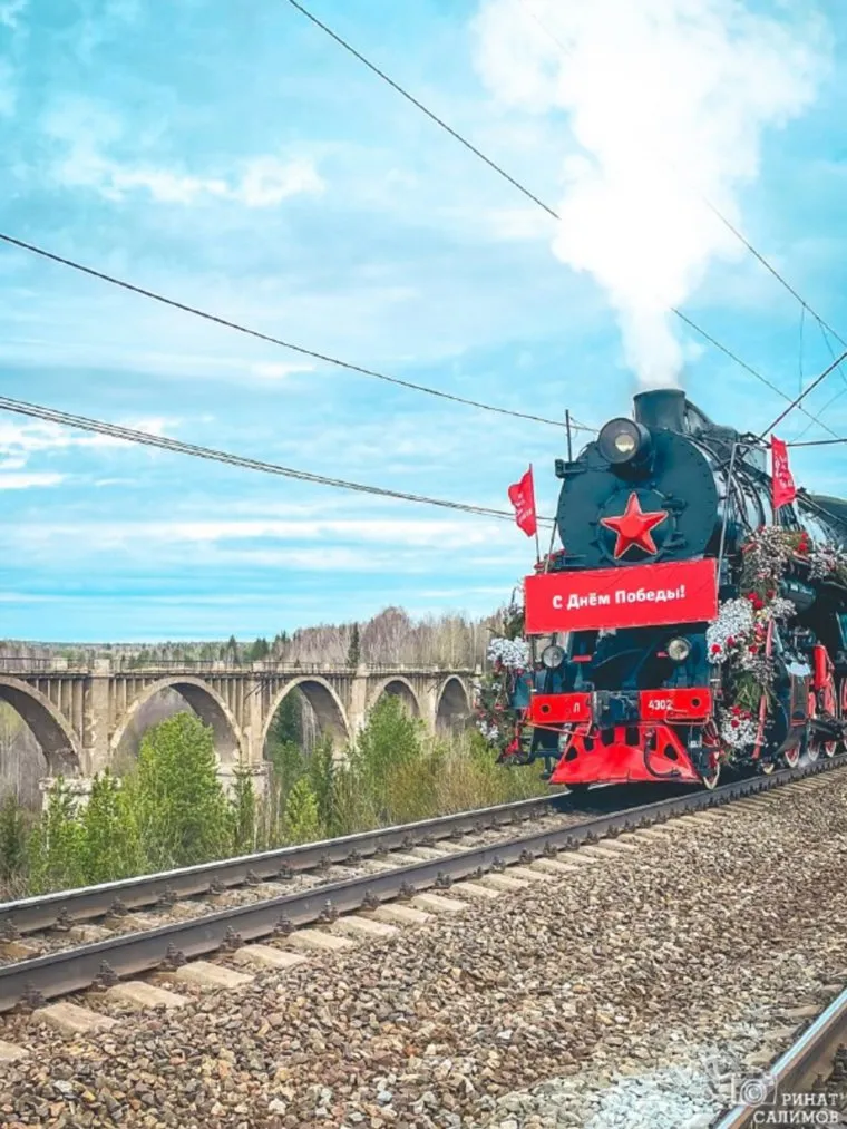 «В год 80-летия Великой Победы мемориальный состав „Поезд Победы“ Л-4302 проехал рядом с 111-летним железнодорожным виадуком — это же история в чистом виде, захватывающая, происходящая на наших глазах, история, которую мы помним, которой гордимся и которую ценим. Снимок уникальный, исторический — ведь в том числе и по этому виадуку с 1941 по 1945 годы туда на западное направление, в сторону фронта подобные паровозы (но другой серии) осуществляли быструю и бесперебойную доставку огромного количества войск, боевой техники и вооружения», — написал к посту с фотографией Салимов.