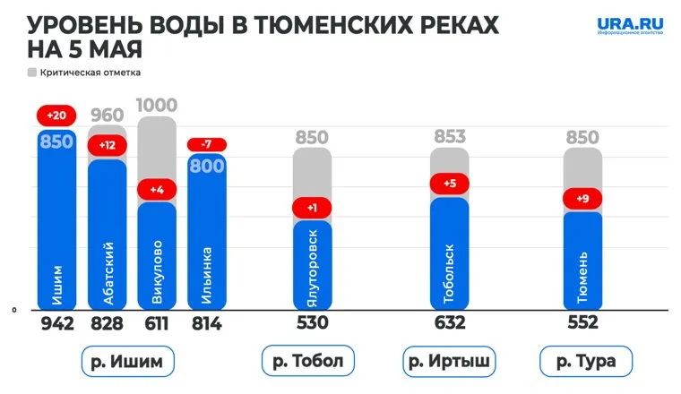«Гидропост Ишим — Ишим. Изменение уровня воды за сутки +20 см. Уровень воды над нулем поста 942 см. Гидропост Ишим — Абатский. Изменения +12 см, уровень воды 828 см», — указано на сайте.