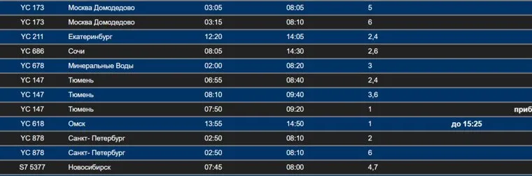 11:44 Рейс из Омска (планируемое время прибытия 14:50) задерживается до 15:25. О прибытии будет объявлено дополнительно.