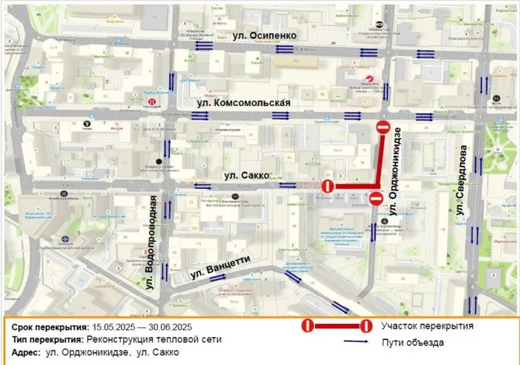 «Временное перекрытие на улицах Орджоникидзе и Сакко. В связи с выполнением работ по реконструкции участка тепловой сети в период с 15 мая по 30 июня планируется прекращение движения транспорта на следующих участках автомобильных дорог: Орджоникидзе — от Комсомольской до Сакко; Сакко — от дома №39 до Орджоникидзе», — говорится в сообщении городской администрации.