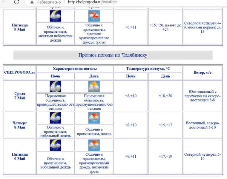 «9 мая в Челябинске облачно, с прояснением, ночью небольшой дождь. Днем — кратковременный дождь, возможна гроза», — сообщили в ЦГМС.