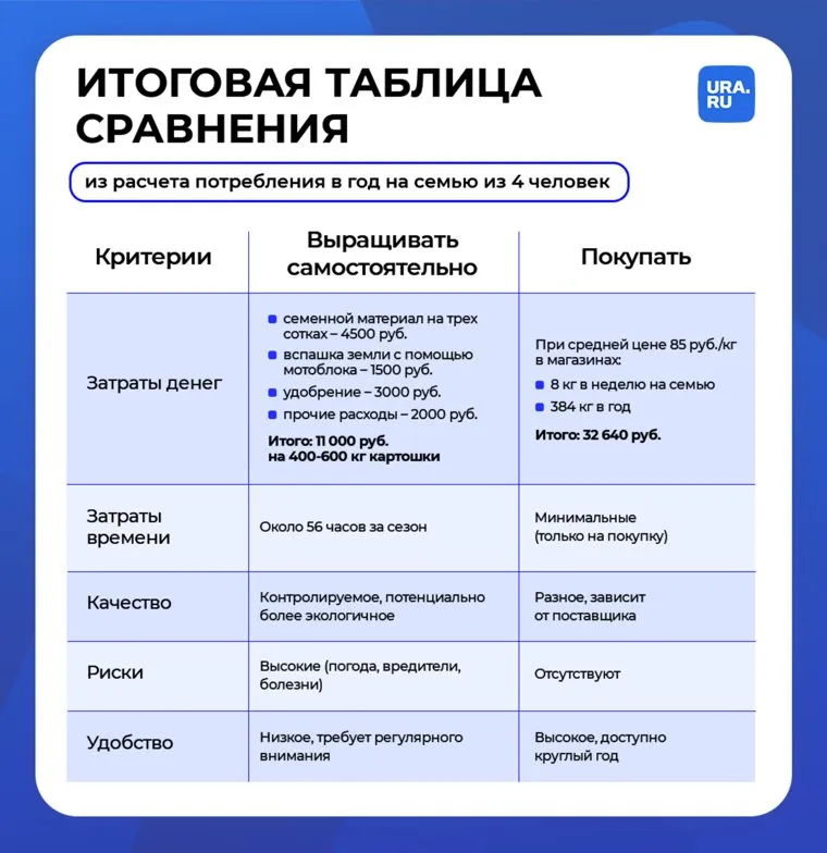 В России продолжается рост цен на картофель, который за год подорожал почти в три раза. На фоне исторических рекордов стоимости этого продукта многие граждане задумываются — не выгоднее ли самим вырастить корнеплоды вместо их покупки в магазине? URA.RU проанализировал затраты на выращивание картофеля, сравнил их с рыночными ценами и выяснил, что помимо экономической стороны вопроса есть другие важные аспекты, которые стоит учитывать при принятии решения — подробнее в материале.