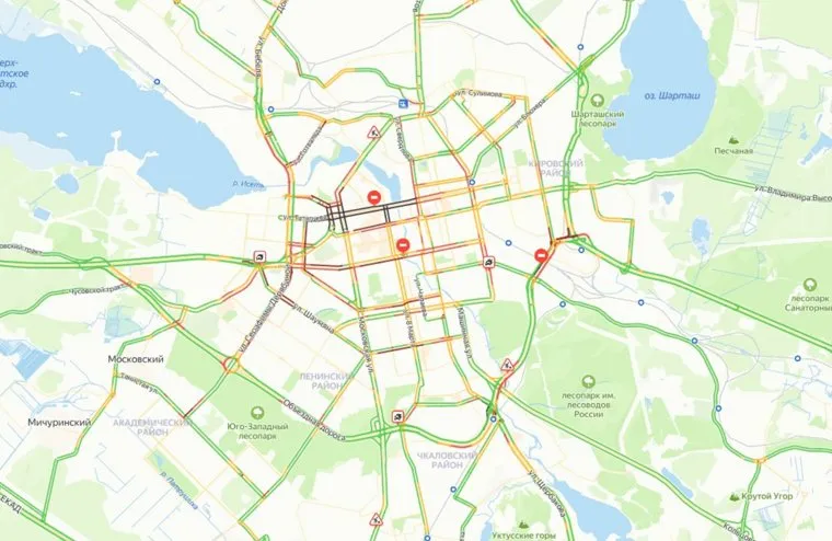 Екатеринбург встал в восьмибалльные пробки из-за репетиции парада Победы. Скрин