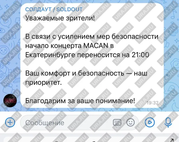 «В связи с усилением мер безопасности начало концерта Macan в Екатеринбурге переносится на 21:00», — следует из сообщения организаторов, которое разослали слушателям. Изначально выступление было запланировано в 20:00.