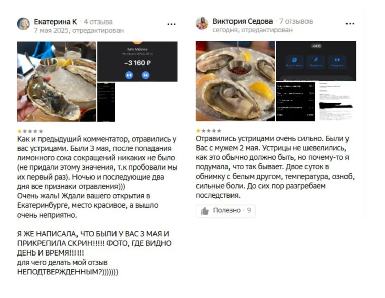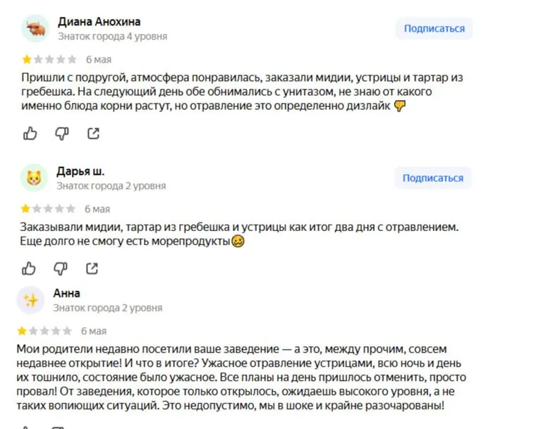 «Отравились устрицами очень сильно. Были у вас с мужем 2 мая. Устрицы не шевелились, как это обычно должно быть, но почему-то я подумала, что так бывает. Двое суток в обнимку с белым другом, температура, озноб, сильные боли. До сих пор разгребаем последствия», — написала 8 мая в сервисе «2ГИС» Виктория С.