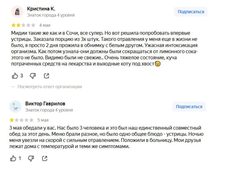 В этот же день впервые попробовать устриц пришла Татьяна с семьей, которые тоже почувствовали симптомы отравления. «Все трое отравились, муж в больнице. Люди, не берите устрицы, если не знаете, как проверить, что с ними все норм. Мы вот не знали. Потом уже прочитали, что они должны от сока лимона сокращаться. Просите, пусть вам официант все покажет и расскажет. Майские все насмарку из-за устриц этих», — возмутилась женщина.