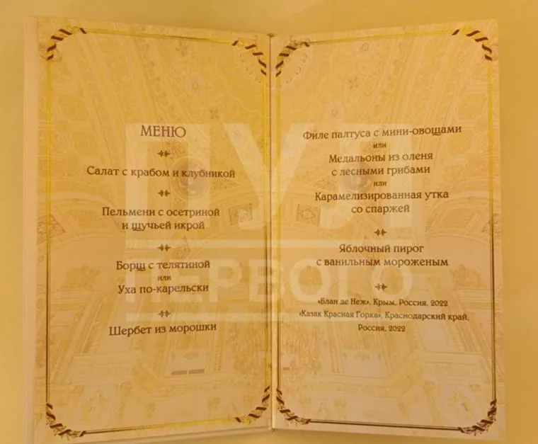 «Салат с крабом и клубникой, пельмени с осетриной и щучьей икрой, борщ с телятиной, уха по-карельски, филе палтуса с мини-овощами, медальоны из оленя с лесными грибами или карамелизированная утка со спаржей», — следует из меню. Его опубликовал telegram-канал «Пул Первого».