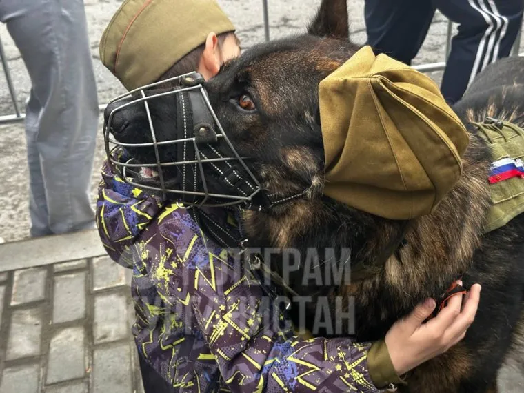 Маленькие дети обнимали и гладили овчарку в пилотке на 9 Мая