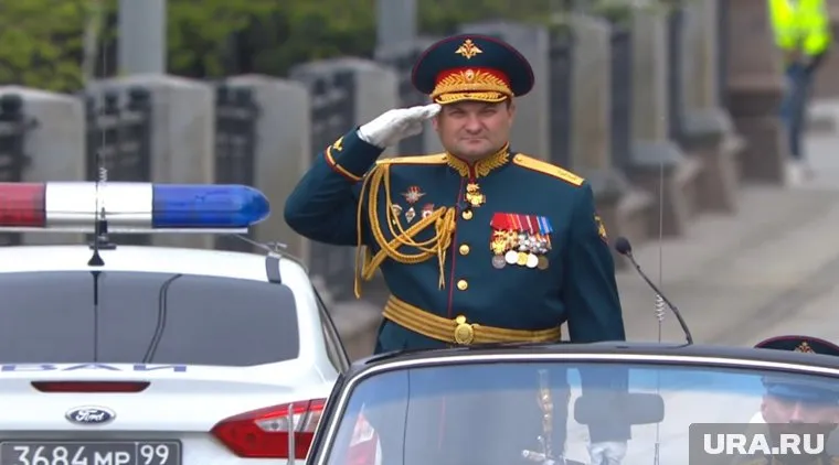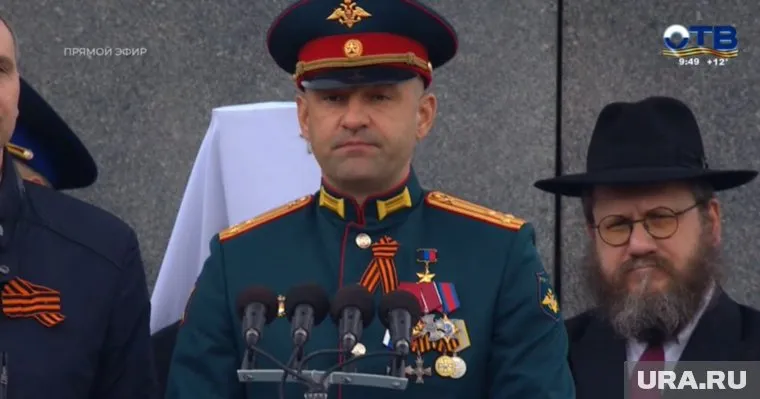 10:08 09.05.2025 Врио командующего войсками ЦВО генерал-лейтенант Дмитрий Глушенков принимает доклад о готовности. Парадом командует генерал-майор Александр Линьков.