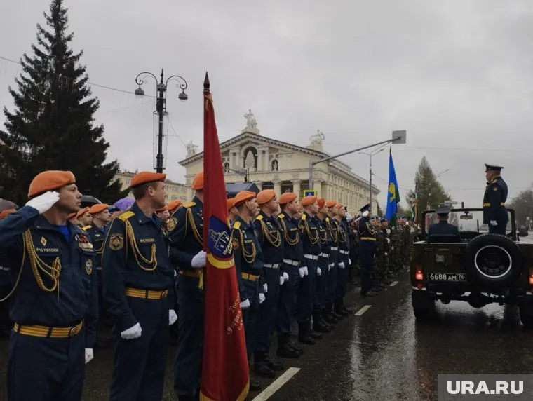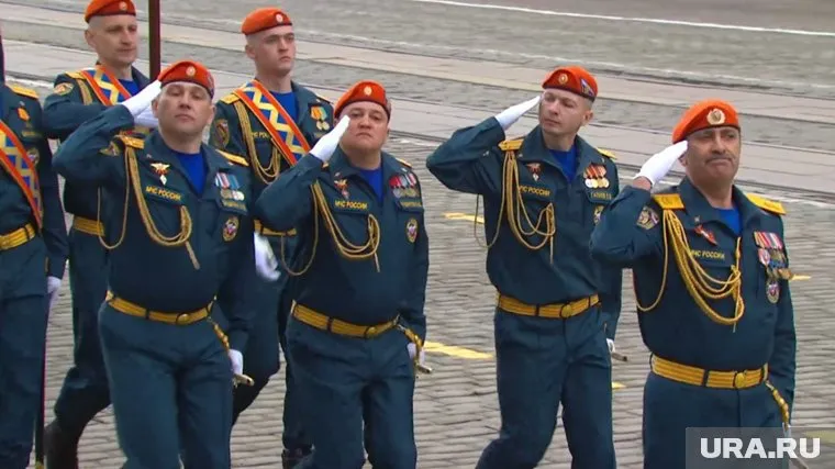 10:29 09.05.2025 Расчет МЧС во главе с шефом регионального управления ведомства Виктором Теряевым. Следом вышли бойцы Росгвардии по УрФО, знамя несет лейтенант Сорокин, второе — Владимир Якушев (однофамилец).