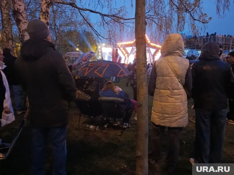 21:25 09.05.2025 «Опытные зрители», — шутят над парой с большим зонтом и стульями.