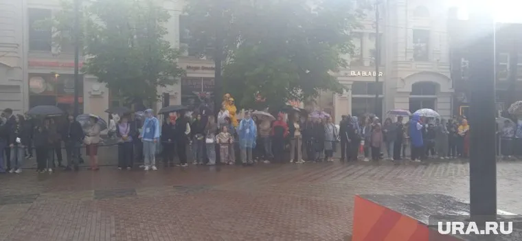 17:37 09.05.2025 В ожидании представления актеры вынуждены мокнуть под дождем. Челябинцы ждут начала под зонтами.
