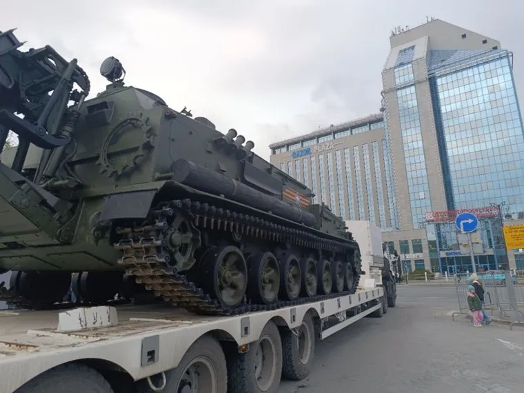 09:17 К параду Победы на улице Республики начинает выстраиваться военная техника.