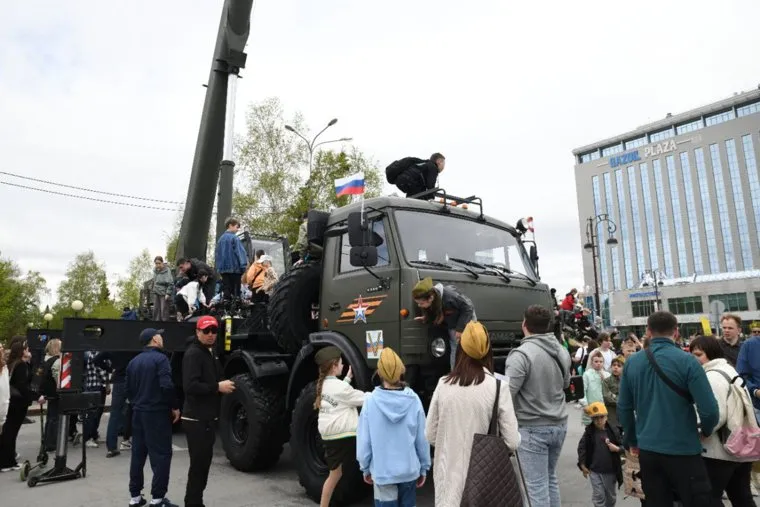 13:44 На площади Памяти продолжаются праздничные гуляния. Тюменцы фотографируются, стоят в очереди за кашей и изучают военную технику.