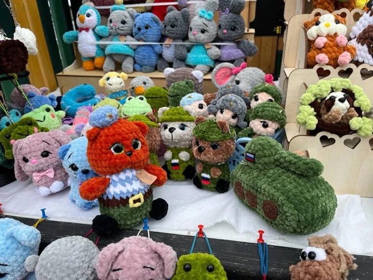 16:28 На площади у тюменской администрации местные мастерицы хвастают талантом. Сегодня в их ассортименте — звери в военной форме и боевая техника.