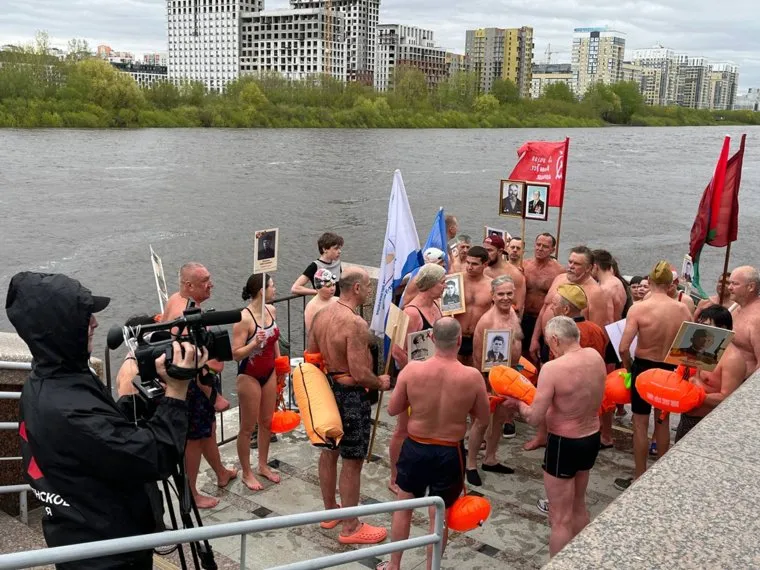13:14 Вторую половину маршрута моржи проплывают с портретами фронтовиков и флагами.