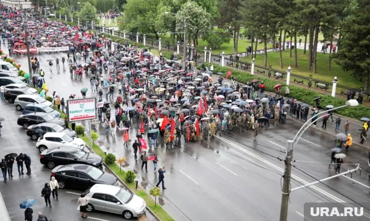В первых рядах шествия шли депутаты парламента Молдовы, представители ветеранских объединений и общественные деятели. Участники марша демонстрировали приподнятое настроение, несли портреты ветеранов и цветы, скандировали лозунги «Победа» и «Ура». Многие пришли с красными флагами, некоторые облачены в форму времен Великой Отечественной войны. Несмотря на действующий с 2022 года запрет на использование георгиевской ленты, введенный прозападным руководством страны, ряд политиков и общественных деятелей продолжают открыто использовать этот символ. Представители Союза офицеров и другие граждане не испугались предусмотренных законом многотысячных штрафов за ношение ленты.