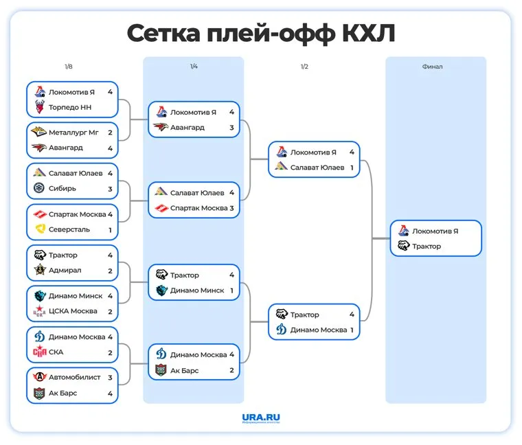 Во вторник, 13 мая 2025, стартует финальная серия Кубка Гагарина между ярославским «Локомотивом» и челябинским «Трактором». Впервые в 17-летней истории КХЛ в решающем противостоянии встретятся победители своих конференций и две лучшие команды регулярного чемпионата. «Трактор» возвращается в финал впервые с 2013 года, а «Локомотив» получил шанс взять реванш после прошлогоднего поражения. Кто станет обладателем главного трофея КХЛ — подробнее в материале URA.RU.