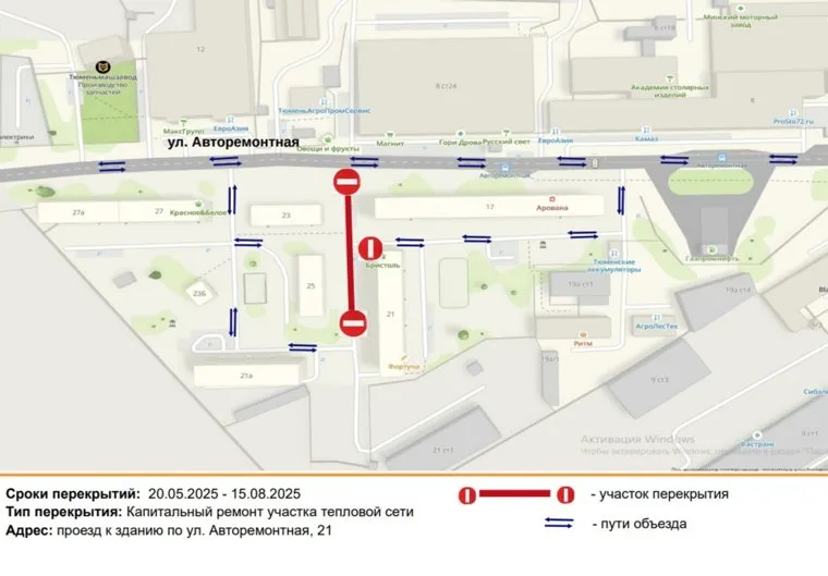«Вниманию пользователей автомобильных дорог. В связи с выполнением работ по капитальному ремонту участка тепловой сети в период с 20 мая по 15 августа будет прекращено движение транспортных средств на проезде в районе здания №21 по Авторемонтной», — говорится в сообщении администрации Тюмени. П