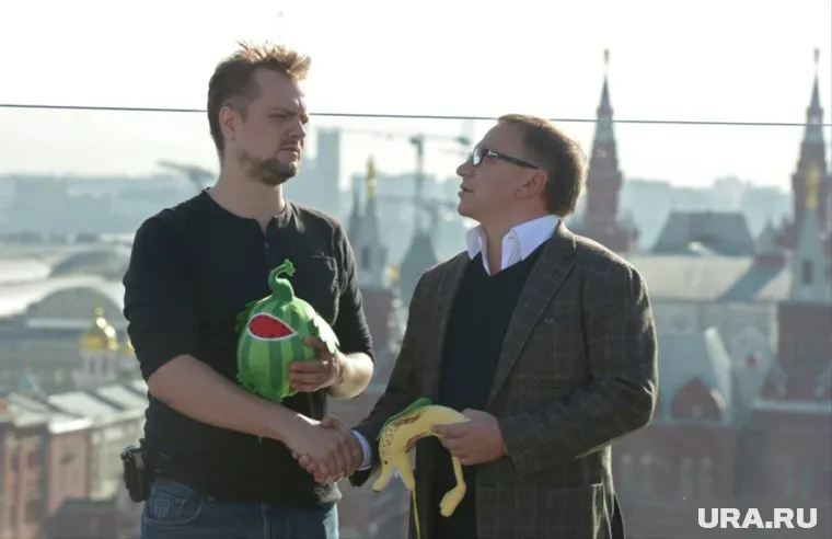 Телеведущие Александр Пушной и Игорь Угольников на фотоколле анимационной картины «Облачно…2:месть ГМО»