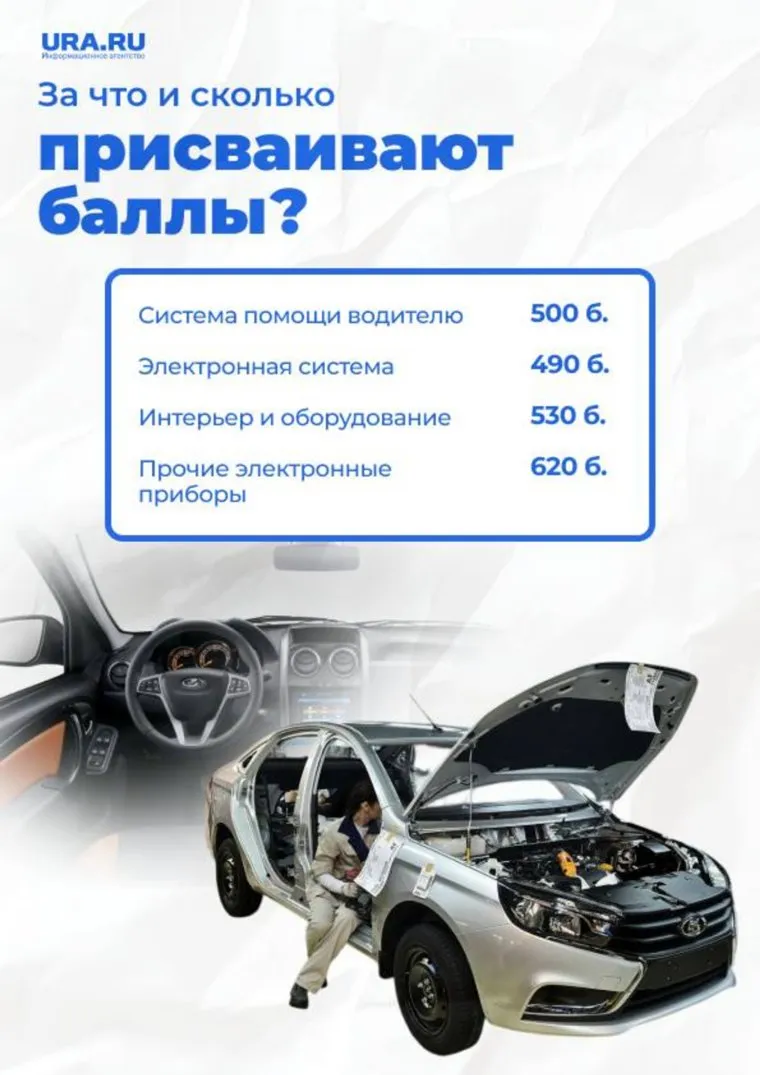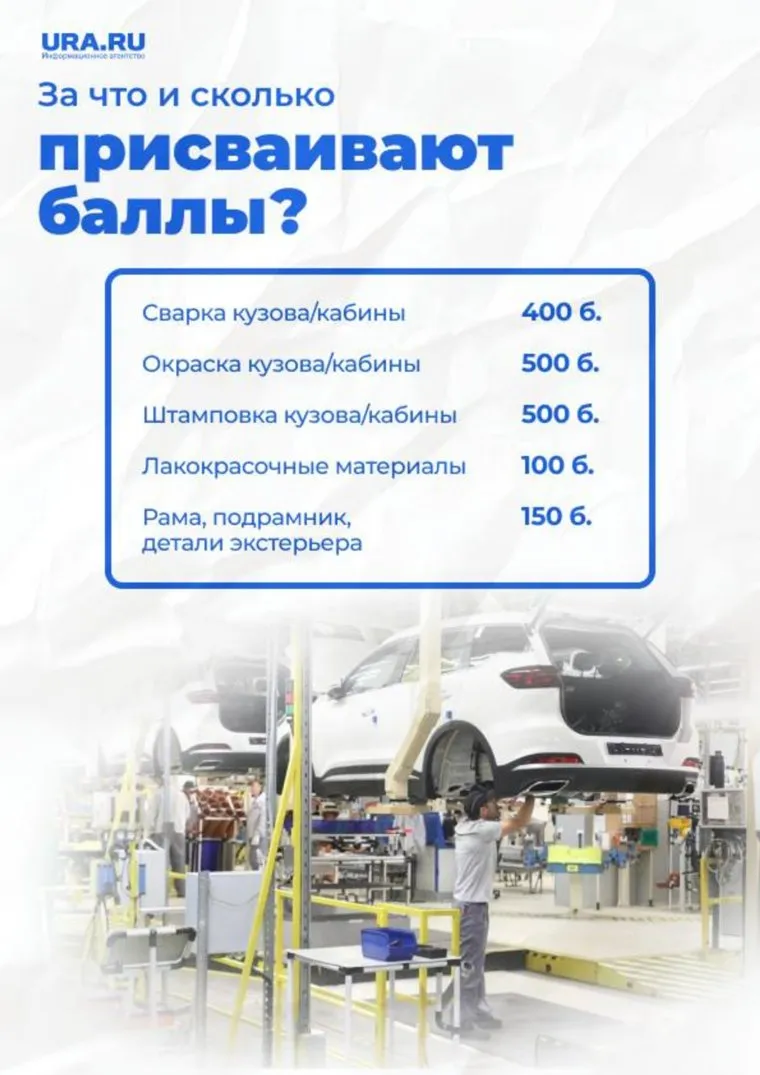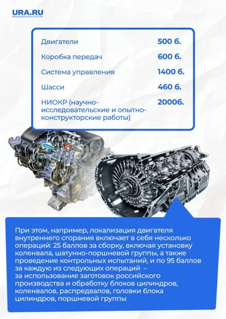 Использование российских лакокрасочных материалов добавляет 100 баллов, а производство рамы, подрамника и деталей экстерьера — 150 баллов. Локализация двигателя внутреннего сгорания оценивается в 500 баллов, включая 25 баллов за сборку (установка коленвала, шатунно-поршневой группы, контрольные испытания) и по 95 баллов за каждую операцию: использование российских заготовок, обработку блоков цилиндров, коленвалов, распредвалов, головки блока цилиндров и поршневой группы.