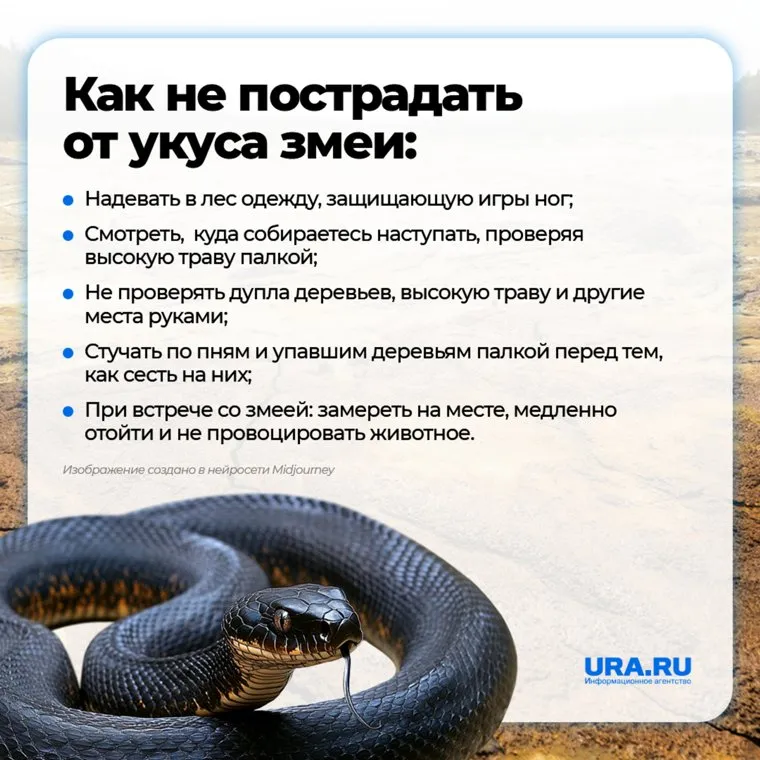 В беседе с URA.RU врач-эксперт лаборатории «Гемотест», хирург Нина Зубова рассказала, что после укуса змеи нужно как можно скорее отойти от нее, а также отодвинуть пострадавшего, если он не может двигаться. Эксперт не рекомендует нападать на змею и пытаться ее убить, так как можно получить повторный укус.
